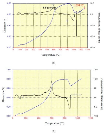 Furthermore, the samples of raw materials S1 and S2, prepared according to ASTM C824-91 [33], were tested for their dilatometric properties. The samples were heated at a rate of 3 °C/min. The results of the testing are shown in Figure 3a,b. The blue curve (integral) shows the relative change of the sample with the temperature expressed in percentages, while the black curve represents the differential dilatometric curve, i.e., linear change expressed in µm/min.