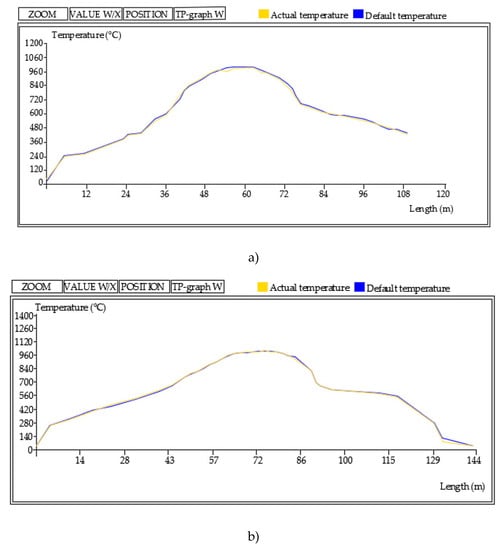 From each of the two raw materials (S1, S2), two sets of bricks were made: one by hand (hand-made bricks) and the other on an industrial line (machine-made bricks). The hand-made bricks were made on the manufacturing line of the company “Old art décor“ d.o.o., Josipovac, Croatia, while machine-made bricks, measuring 250/120/65 cm, were produced on an industrial line at “OPEKA” d.d. brick company Osijek, Osijek, Croatia. There were 100 specimens of bricks made by hand and 100 industrial bricks from each raw material (S1, S2). All brick specimens were dried for 45 days. They were placed on a flat ground covered with sand to prevent the sudden loss of moisture. After drying, the firing process followed in an industrial kiln (Hans Lingl Anlagenbau und Verfahrenstechnik GmbH & Co. KG kiln from 2003, Lingl, Krumbach, Germany). The used firing regimes are shown in Figure 4.