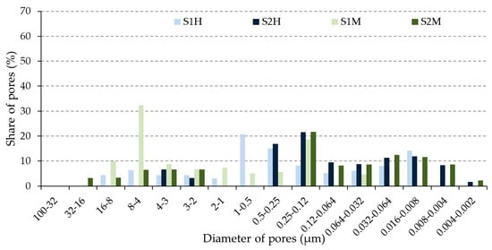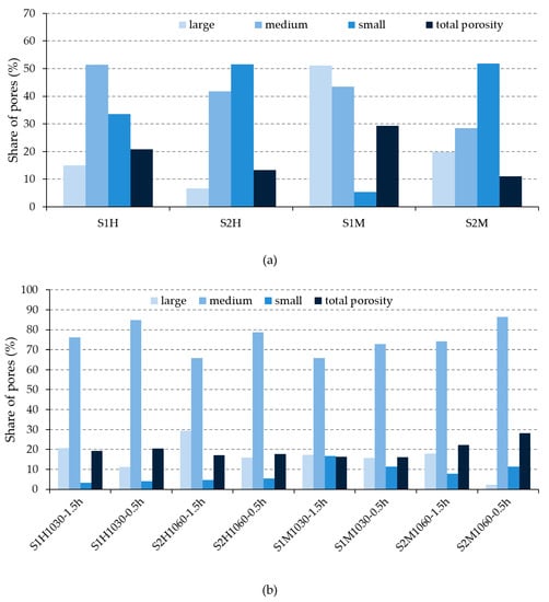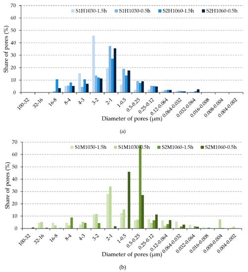 The opposite was true for the hand-made bricks: the ratio of medium pores was lower for bricks made of clay with a higher content of CaCO3 (S2) (e.g., S1H1030-1.5h vs. S2H1060-1.5h; S1H1030-0.5h vs. S2H1060-0.5h), but the share of large pores was higher. Considering that the trends in the pore ratios were different for hand and machine-made bricks, it was not possible to conclude whether the raw material unambiguously affected the durability values or if it was due to the shaping procedure.