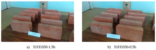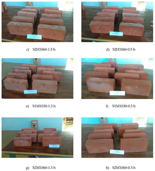 Comparing the ratio of compressive strengths (Table 6) of the bricks made from the same raw material and with the same retention time at the maximum reached temperature, but shaped differently (hand-made/machine-made) (S1H1030-1.5h vs. S1M1030-1.5h; S2H1060-1.5h vs. S2M1060-1.5h), it could not be concluded that shaping procedure directly affect their resistance to freeze–thaw cycles, which is contrary to the conclusions given in [19,20,21]. Evidently, the shaping procedure influenced the structure of pores in the case of the unfired bricks (Figure 7a), but the microstructure changes, after the firing process, defined their final resistance.