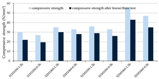 Reviewing the ratio of compressive strengths before and after the freeze–thaw cycles, it could be firmly concluded that the bricks with a longer retention time at the maximum temperature (1.5 h), generate a better resistance to freeze–thaw cycles than bricks with a shorter retention time (0.5 h): the ratio of compressive strengths was higher in the case of S1H1030-1.5h than in S1H1030-0.5h, again higher in the case of S1M1030-1.5h than in S1M1030-0.5h. The explanation could be found in the change of microstructure but also of the pore structure, Figure 7b. These results point out that the bricks retained longer at the maximum temperature (1.5 h), regularly report a greater share of large pores and a smaller share of medium pores than the bricks made from the same raw material, using the same type of manufacture (hand-made or machine-made), but fired at the same temperature for a shorter amount of time (e.g., S1H1030-1.5 h vs. S1H1030-0.5 h; S1M1030-1.5 h vs. S1M1030-0.5 h). This result is compatible with the reference literature [5,6,7,8,9,10].
