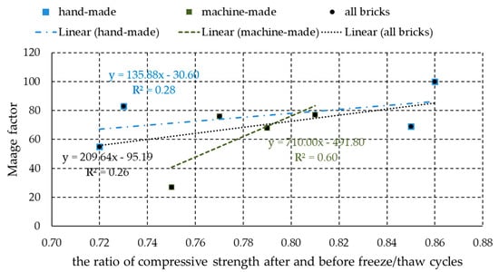 It is evident (Table 6) that the bricks, which are assessed to be resistant to freeze–thaw cycles according to HRN B.D8.011 [36], have the ratio of compressive strengths over 0.72 and the Maage factor in range 27 to 100. Based on the reference literature [5,6,7,8,9,10], only the bricks with the Maage factor higher than 70 are considered resistant to freeze–thaw cycles. However, in the research, even the bricks with a smaller Maage factor (68:27) proved to be resistant. While trying to make a relation between the ratio of compressive strengths and the Maage factor (Figure 10), a low coefficient of correlation of R2 = 0.26 for the equation y = 209.64x − 95.19 (y is the Maage factor and x is the ratio of compressive strengths) was obtained in the case that all bricks were analyzed together regardless of the method of brick forming. However, if the results are processed separately for hand-made and machine-made bricks (Figure 10), it is evident that machine-made bricks have a significantly higher correlation coefficient value than hand-made bricks. Namely, the coefficient of correlation of R2 = 0.28 for the equation y = 135.88x − 30.60 was achieved for hand-made bricks, while machine-made bricks achieved the coefficient of correlation of R2 = 0.60 for the equation y = 710.00x − 491.80. A higher correlation coefficient value for machine-made bricks could be due to greater uniformity characteristics of those bricks compared to hand-made bricks. If such a correlation between the Maage factor and the ratio of compressive strengths before and after the freeze–thaw cycles for machine-made bricks is confirmed on a larger number of testing results, this parameter could be used as an additional method for assessing brick resistance to freezing and thawing cycles. This interesting observation will be further explored by the authors.