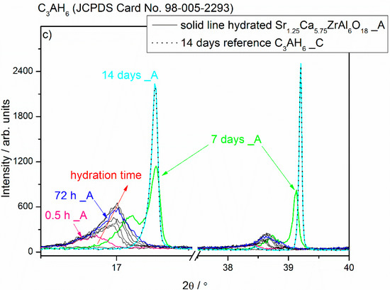 X-ray diffraction patterns of the Sr1.25Ca5.75ZrAl6O18 cement paste (Sample A) at different curing periods. (a,b) contains lines of two reference materials, i.e., Sr3AH6 synthesized through hydration from SrAl2O4 cement (Sample B) and C3AH6 synthesized through hydration from Ca7ZrAl6O18 cement (Sample C). (c) contains a line (dot line) of the reference C3AH6 formed at 14 d (Sample C).