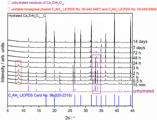 The overview XRD spectra recorded from the reference Ca7ZrAl6O18 cement paste (Sample C) at different curing periods from 15 min to 14 d is shown in Figure 3. The hexagonal hydrates exist with the still unhydrated residues of the Ca7ZrAl6O18 in cement paste between 15 min and 3 h of curing period, whereas C3AH6 hydrated phase is formed at the curing age of 0.5 h. At the age of 24 h, the XRD pattern of the cement pastes exhibits profile similar to that of pure C3AH6 without any traces of unhydrated cement particles Ca7ZrAl6O18 and metastable hydrates.