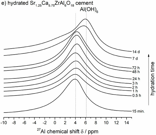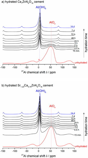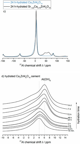 - The hydration of both Ca7ZrAl6O18 and Sr1.25Ca5.75ZrAl6O18 cements was also inspected using the 27Al MAS NMR technique. This hydration is accompanied by a change of Al-coordination from tetrahedral to octahedral. This complete conversion from anhydrous 27AlIV to hydrated 27AlVI species was achieved during the first 24 h of hydration at 50 °C for Ca7ZrAl6O18 and during 7 d of hydration at 50 °C for Sr1.25Ca5.75ZrAl6O18.