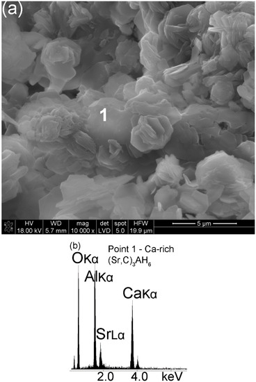 Most of the C3AH6 or Ca-rich (Sr,C)3AH6 crystals formed after a hydration time of 7 d attain the shape of cubes, pyritohedra or other more complex forms of the isometric system, which are reinforced with Al(OH)3 crystals (Figure 6a,c). As observed before, those hydration products are strongly dependent on curing time and the Ca peak (Figure 6b) intensity increases relative to the Sr peak intensity (Figure 5b). Hence, as the curing time increases, the crystals belonging to a cubic or isometric system formed initially as a transient Sr-rich (Sr,C)3AH6 were replaced with Ca-rich (Sr,C)3AH6 or pure C3AH6. An unavoidable change of one form of calcium aluminate hydrate to another can be found elsewhere [32,33,34].