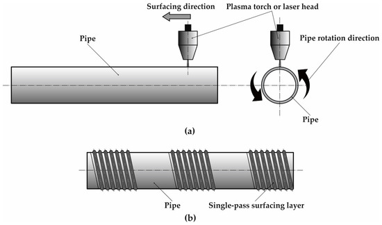 Schematic of outer 16Mo3 steel pipe surface surfacing with nickel-based superalloy Inconel 625: (a) movement of plasma/laser head and pipe rotation, (b) arrangement of surfacing passes on the pipe surface.