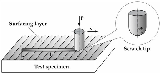 To establish scratch resistance and kinetic friction coefficient of surfaced layers, macroscale scratch tests—Revetest (RST) on Revetest Xpress Scratch Tester machine (Anton Paar Instruments, Graz, Austria) were performed. Scratch tests were carried out with the use of Rockwell diamond indenter of radius R = 200 μm. Constant Load Scratch Test (CLST) mode of scratch testing was used. The indenter travel direction was parallel to the pipe axis and velocity was v = 0.3 mm/min on test length l = 5 mm with constant load P = 100 N. Schematic diagram of the scratch test is presented in Figure 2.