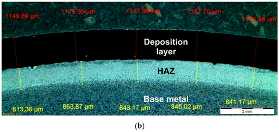Carried out macroscopic examinations of Inconel 625 surfaced layer and 16Mo3 steel pipe base material did not reveal any defect such as: cracks, lack of penetration, gas pores, and other types of discontinuities in fusion line area both powder plasma surfacing and powder laser surfacing. Lack of defects presence in the fusion line area indicates correct parameter selection and sufficient preparation of the pipe surface. Sample macrostructures of the fusion line between nickel-based superalloy surfaced layer and steel pipe base material are shown in Figure 4. The measured thickness of nickel-based superalloy layer manufactured by powder plasma surfacing was 1.2–1.7 mm (Table 8). The measured thickness of nickel-based superalloy layer manufactured by powder plasma surfacing was 0.6–1.3 mm (Table 9). The measured values are lower than recommended 2.5 mm [8,9]; however, taking into consideration the high price of nickel alloy additional material and the difference in heat transfer coefficient between nickel- and iron-based alloys surfaced layers can be considered to be conforming to criteria for exploitation and optimal [35,36]. Surfaced layers were manufactured as a single layer surfaced without post-weld heat treatment.