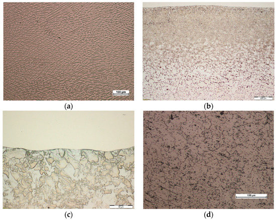 View of the microstructure of Inconel 625 superalloy coating layer obtained in the process of plasma powder transferred arc surfacing on the outer surface of 16Mo3 steel pipe (sample P2): (a) coating layer area, mag. 100×, (b) general view HAZ area mag. 100×, (c) HAZ area at the fusion line, mag. 500×, (d) base material, mag. 200×.