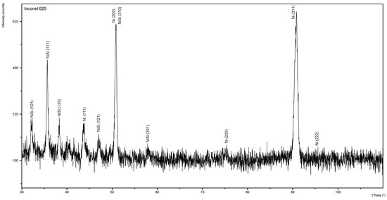 X-ray diffractogram for singular surfaced layer of nickel-based superalloy Inconel 625 manufactured by powder plasma surfacing (sample P2) was presented in Figure 8. Similarly in powder laser surfaced layer and powder plasm surfaced layers examinations main counts peaks from nickel are observed on diffractogram with angles: 2θ = 43.66°, 50.85°, 75.34°, 90.83°, and 96.74°. However, main count peaks for pure nickel crystalline structure from JCPDS-ICDD database angles are: 2θ = 44.51°, 51.85°, 76.37°, 92.94°, and 98.45°. In the case of analyzed sample counts peaks from crystallographic planes γ (111), γ (200), γ (220), and γ (311) were observed with slightly higher angle 2θ. This difference can be caused by the change of lattice parameters due to the solid solution of Inconel 625 alloying elements in Ni lattice and strengthening phases precipitations. In the surfaced layer Ni-Si phase with lattice Miller indices (101), (111), (120), (121), (301), and (310) was found. Moreover, in the surfaced layers manufactured by powder plasma surfacing or powder laser surfacing no other phases with parameters comparable to pure Ni were found.