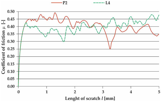 Coefficient of friction as a function of scratch length for Inconel 625 superalloy layers obtained in the process of plasma powder transferred arc surfacing (sample P2) and of laser surfacing (sample L4).