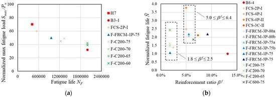 State of the art analysis: (a) relationship between normalized maximum applied fatigue load and fatigue life; (b) relation between normalized fatigue life and reinforcement ratio.