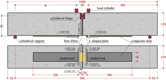 A 4-point bending set-up was used. The beams were placed on two cylindrical supports 900 mm apart, whereas the load was applied by two steel cylinders connected to the machine by a spherical hinge. Six linear variable displacement transformers (LVDTs), named H1, H2, H3, H4, V1, and V2 (Figure 3), were used to measure the displacement of the fiber textile with respect to the concrete support and the midspan vertical deflection of the specimen. Two LVDTs were attached to each concrete block at the strip loaded ends (H1 and H2 on one side and H3 and H4 on the opposite side, see Figure 3) and reacted off of L-shaped steel plates bonded to the midspan bare fibers at the FRCM loaded ends. The remaining two LVDTs (V1 and V2) were used to measure the midspan vertical deflection on each side of the specimen.