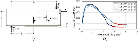 Modified beam tests: (a) free body diagram; (b) σ-g responses at fully debonded side (FDS) of quasi-static monotonic tests (the peak stresses σ* are indicated with a “x” marker whereas the curve portions characterized by first derivative values within the range (−200,0) are depicted in red).