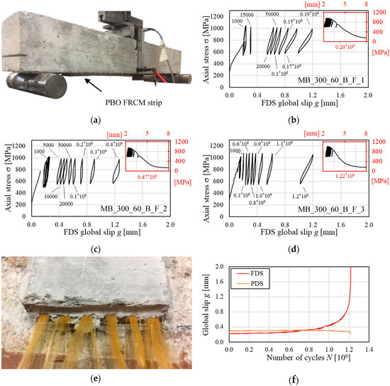 The three specimens subjected to the fatigue test failed due to matrix-fiber debonding and eventual rupture of the fibers at the strip loaded ends (failure mode c in Section 2.1). Figure 5b–d show the load responses of the specimens subjected to fatigue cycles in terms of axial stress, σ, in the fibers versus global slip, g, on FDS. In particular, Figure 5b–d feature the following portion of the response: (i) the load response associated with the initial quasi-static monotonic test, (ii) representative 10-cycle blocks selected at different number of cycles, and (iii) the σ-g response of the 10 cycles preceding failure of the specimen. During the first part of the fatigue test, the behavior of the FRCM strips attached to the two concrete prisms was symmetrical, as it could be inferred from the readings of LVDTs H1 and H2 and LVDTs H3 and H4. As the number of load cycles increased, the global slip measured at one side of the specimen, the FDS, started to increase at a higher rate with respect to that measured on the opposite side (i.e., the PDS) and the specimens entered in the second part of the test. The global slip increase on the FDS could be attributed both to a progressive debonding at the matrix-fiber interface and to damage and eventual rupture of some fiber filaments due to the interlocking action with the embedding matrix [20,30]. Due to the progressive debonding and fiber damage, the stiffness of the specimen decreased, as can be inferred by the decreasing slope of the 10-cycle blocks as the global slip increased. The decrease in stiffness was associated with an increase of area enclosed by each cycle in Figure 5b–d. Further analyses are needed to clarify whether the progressive matrix-fiber debonding or damage and rupture of the fiber filaments was mainly responsible for the progressive degradation of the specimen mechanical properties during the fatigue steady stage. With the increase of the number of cycles, the specimens entered a non-steady stage where g rapidly increased on the FDS until sudden collapse due to complete rupture of all fiber filaments, as shown in Figure 5e for specimen MB_300_60_B_F_3, occurred. Since the fatigue test was load-controlled, no residual constant applied stress could be observed at the end of the test. In fact, due to the progressive fiber filaments rupture, the specimens were no longer able to sustain the stress within the fatigue range applied, which determined the complete failure of the fibers.