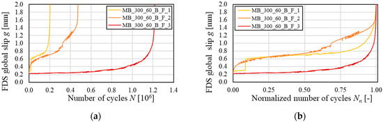 FDS global slip vs. (a) number of cycles and (b) normalized number of cycles for specimen subjected to fatigue test.