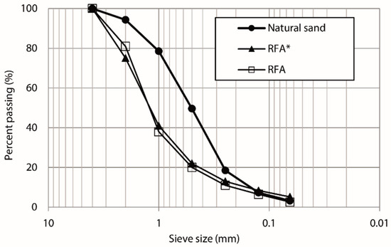 Table 7 shows the results of the characterization of natural sand and recycled aggregates. The percentage of fine content refers to particles smaller than 0.063 mm. The sand equivalence values for recycled aggregates are similar to those of natural sand. According to the background literature review, recycled aggregates have a lower dry density than natural sand (NS). As expected, the water absorption value in all recycled aggregates is high with respect to that of NS [29,30]. The absorption of RFA is slightly higher than that exhibited by RFA*, probably due to the impurities that the first of these aggregates possesses.