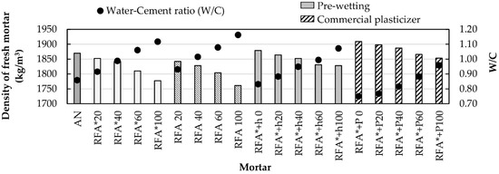 Figure 2 shows the changes in bulk density of fresh mortar with respect to the percentages of substitution of natural sand (NS) with RA, as well as its corresponding W/C ratio.