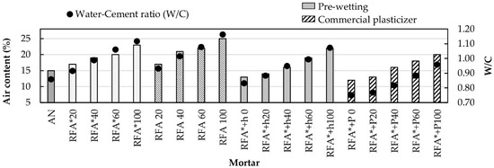 Air content in mortar mixtures is an important parameter because it influences aspects such as durability and compressive strength. In spite of this, there are no specified limits for the amount of air in mortar mixtures. However, some researchers suggest that acceptable air contents are in the range of 5% to 20%, which was adopted as a reference in this work [40]. Figure 3 shows the variation of air content in fresh mortar with respect to the percentages of substitution of natural sand (NS) for RA, as well as its corresponding W/C ratio.