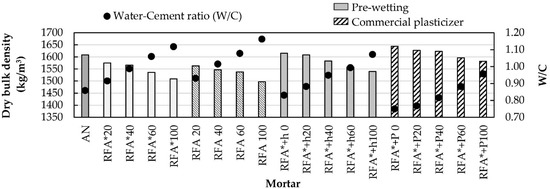 The bulk density of the hardened mortar at an age of 28 days and the W/C ratio for all mortar families are shown in Figure 4. As happens in the fresh state, it is observed that as the replacement percentage and the W/C ratio increase and density decreases, which is consistent with what was observed by other researchers [40]. It is noted that the control mortar (NS) develops a greater density than that of mortars of the RFA* and RFA families. An analysis among the latter makes it clear that mortars manufactured with aggregates obtained by a deconstruction process exhibit a higher dry bulk density, confirming the trends shown by the bulk density in the fresh state. Again, the best results were shown by mortars of the RFA* + h and RFA* + P families. The mixtures that incorporated commercial plasticizer exhibited the highest dry bulk densities for each percentage of substitution, in agreement with the observations of Pereira et al. [8] and Cartuxo et al. [11]. This is because these mixtures have the lowest values of W/C ratio and air content.