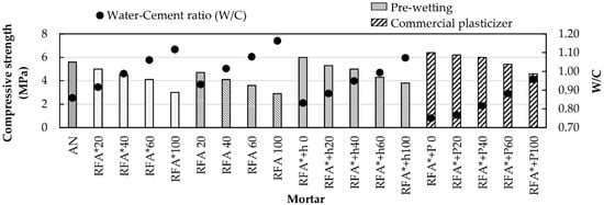 Continuing with the trend of previously analyzed properties, compressive strength decreases as the percentage of sand substitution by RA increases, as can be seen in Figure 5. This is in agreement with observations by Cuenca-Moyano et al. [40] and Zhao et al. [42]. The decrease in the compressive strength of all mixtures as the percentage of substitution increases is due to the increase in the W/C ratio required to maintain workability. Examining the compressive strengths of the RFA* and RFA mixture families, it can be observed that the former reach slightly higher values. These results confirm the importance of obtaining RA through a deconstruction process. The mixtures made with pre-wetting of the aggregates (RFA* + h) exhibited a greater resistance for each substitution level than the RFA* and RFA families, which is indicative of the importance of pre-wetting the aggregate before making the mortar mixtures. The highest resistances were obtained for mixtures added with commercial plasticizer. This is because this family of mixtures required less water during its manufacture, so the W/C ratio was lower. In Figure 5, it can be seen that the control mixture meets the minimum resistance indicated for M5 mortar (5 MPa). The RFA* and RFA mixtures did not meet this requirement. On the other hand, of the pre-moistened mixtures, only those with substitution percentages ranging from 60% to 100% were below the 5 MPa resistance. On the other hand, it can be seen that in mixtures with commercial plasticizer added, only those with a 100% substitution do not meet the minimum resistance value for the type of mortar used.