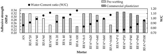 Adhesive strength is a fundamental property of masonry mortars. The characterization of this property was performed using the European standard UNE-EN 1015-12 [58]. Figure 6 shows the results obtained for each of the families of mixtures. In general, the same trend is observed as for the other properties studied so far: the adhesive strength is affected as the replacement ratio and the W/C ratio increase. These observations are consistent with those made by Amorim et al. [62] and Silva et al. [18]. Comparing with mixtures to which no plasticizer was added, it is noted that similar behaviors exist for the same replacement rates. The highest adhesive strength values were obtained for mixtures added with commercial plasticizer.