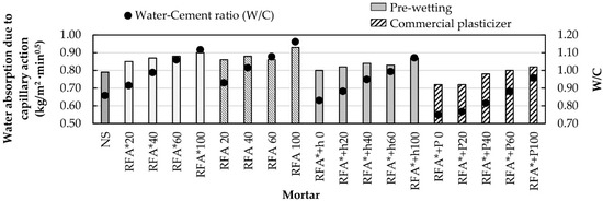 RFA* + h and RFA* + P mixture families are shown to have the lowest absorption values due to their low water consumption. These mixtures exhibit a water consumption similar to the control mixture for substitution percentages of 20% and 60%, respectively. The mix made with the commercial additive and 20% RFA (RFA* + P20) exhibits less water absorption than the conventional mortar mix.