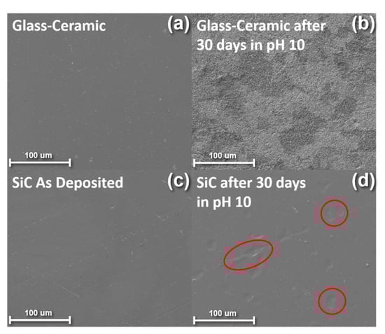 Figure 1 shows SEM images of an uncoated glass-ceramic disk before and after corrosion in a pH 10 buffer solution (a–b) and a SiC-coated ceramic disk before and after immersion in a pH 10 buffer solution (c–d). The uncoated fluorapatite glass-ceramic disks showed a significant increase in surface roughness after immersion. Ceramic corrosion can either occur through a total dissolution of the glass-ceramic network or through ionic exchange between network modifiers and ions in the surrounding solution [1]. In the case of the pH 10 buffer solution used in this study, total dissolution of the network-formers occurred, causing the increased surfaced roughness shown in Figure 1b. In contrast, Figure 1d illustrated that the SiC was successful in protecting the glass-ceramic from corrosion. These results agree with the previous literature reporting on the weight loss after corrosion of uncoated glass-ceramics as compared to SiC-coated glass-ceramics [33]. Andrews et al. examined the mechanism of corrosion for SiC in both acidic and basic conditions. In acidic conditions, a passivating layer of SiO2 is formed that prevents the dissolution of SiC, whereas in basic conditions, the SiC directly dissolves into SiO32− [55]. Another group compared the corrosive effects of SiC-coated glass-ceramics in pH 2, 7, and 10 buffer solutions and found that the pH 10 conditions exhibited the most severe corrosive effects [33]. Based on these previous findings, we have chosen a pH 10 buffer solution to evaluate our SiC film since this solution type demonstrated the harshest corrosive behavior. The regions circled in red in Figure 1d highlight areas of SiC that have delaminated from the glass-ceramic substrate after immersion in the pH 10 solution. Although, these results indicate that coating glass-ceramics in SiC could be an effective way to mitigate corrosion effects, further optimization is required to enhance the chemical durability of SiC films to prevent delamination and bubbling. To accomplish this task, the remainder of this report will focus on annealing and plasma treatment steps taken post-SiC deposition to improve SiC’s durability in caustic environments.