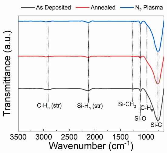 FTIR spectra of plasma-enhanced chemical vapor deposition (PECVD)-deposited SiC as-deposited, after 400 °C post-deposition annealing, and after 10 min of N2 plasma treatment.