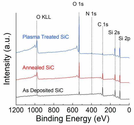 XPS survey scans of PECVD-deposited SiC as-deposited, after 400 °C post-deposition annealing, and after 10 min of N2 plasma treatment.