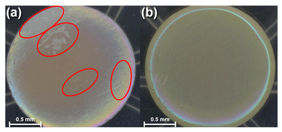 After characterizing the effects of N2 plasma treatment and post-deposition annealing on the PECVD-deposited SiC films, three disks per condition were immersed into a pH 10 buffer solution to quantify if the added processing steps reduced delamination and bubbling. Figure 5 shows optical microscope photos of fluorapatite glass-ceramic disks coated in SiC after immersion in a pH 10 buffer solution for 30 days. The disk in Figure 5a was coated in SiC and then directly immersed into the pH 10 buffer solution, whereas the disk in Figure 5b was plasma-treated with N2 for 10 min and then annealed before being placed into a pH 10 buffer solution. An optical surface-area analysis tool was utilized to quantify the amount of film peeling/bubbling after immersion. The as-deposited SiC-coated glass-ceramics exhibited an average of 94% of the film either peeling or bubbling after immersion. For the SiC-coated ceramic that was plasma-treated and annealed, the film delamination and bubbling was measured to be approximately 2.9% after immersion.