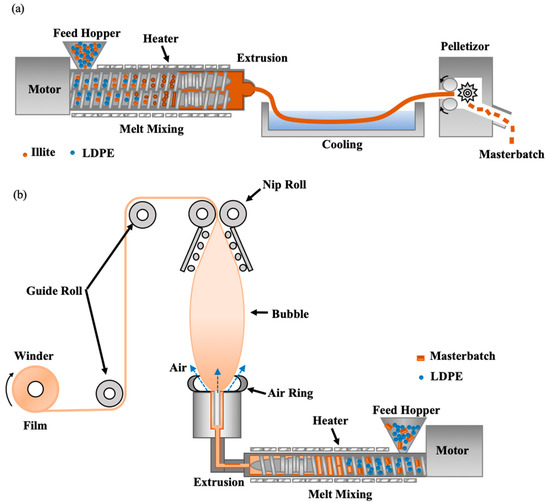 Schematic diagrams for preparation of (a) illite-PE masterbatch and (b) illite-PE film.