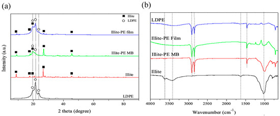 (a) XRD and (b) FT-IR spectra of illite, iliite-PE masterbatch, and iliite-PE film.