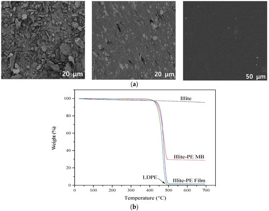 (a) SEM images and (b) TGA analysis of illite, iliite-PE masterbatch, and iliite-PE film respectively.