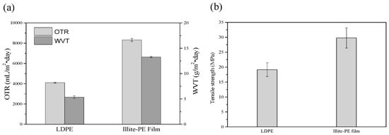 Comparison of (a) oxygen transmission rate (OTR) and water vapor transmission rate. (WVTR), and (b) tensile strength of control LDPE and illite-PE film.