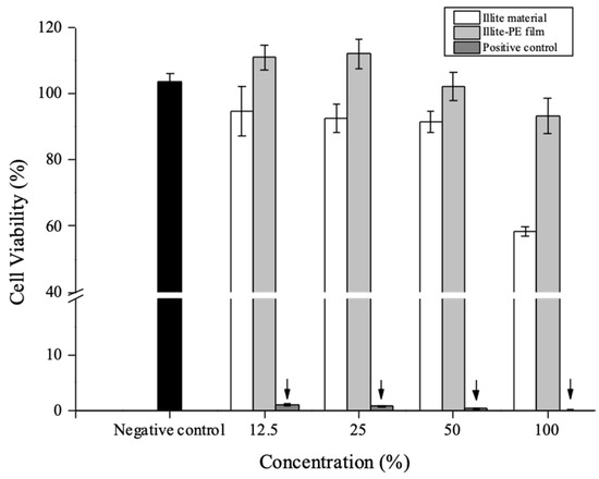 Figure 5 shows the in vitro cytotoxicity assessment for illite and illite-PE composite film using MTT assay, where L929 mouse fibroblast cells were exposed to the various concentrations of the extracts from illite and illite-PE composite film. They were shown to be capable of metabolizing a dye as 3-(4,5-dimethylthiozol-2-yl)-2,5-diphenyl tetrazolium bromide. Cell viability was calculated using the following Equation (1).