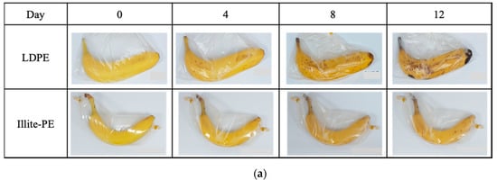 Figure 6 shows the results of the evaluation of the freshness-maintaining function of the illite–PE composite film. The changes in the state of bananas in the control PE film and the illite–PE composite film were checked once every 4 days. The bananas packaged in the control PE film began to change starting on the 4th day, and were severely changed in terms of decay and the color of the peel on the 12th day. The bananas packaged in the illite-PE composite film began to change starting on day 8, and part of them turned black on day 12. The chromaticity of the banana was 46.6 and 46.5 for the control and illite-PE composite film at the beginning, respectively, and 13.0 and 40.7 after 12 days. Thus, the changes were 72.1% and 12.5% over 12 days, respectively. As a result, both visually and in terms of chromaticity, the bananas stored in illite-PE composite film had a lower degree of ripening and decay compared to those stored in the control PE film.