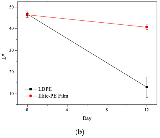Comparison of (a) freshness-maintenance property and (b) chromaticity changes of illite–PE film and control LDPE for 12 days.