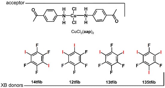 In this work, we were interested in testing the possibility of obtaining halogen-bonded cocrystals with coordination compounds featuring monodentate ligands. Additionally, we wanted to observe whether chloride ligands would hinder the formation of the desired halogen bond. To explore this, we have prepared a square-planar copper(ii) complex that has both two chloride ligands and two 4-aminoacetophenone (aap) molecules as monodentate ligands, whose pendant acetyl group enables halogen bonding. For the cocrystal synthesis as halogen bond donors, we have selected a series of perhalogenated benzenes that differ in the number and positions of donor atoms: 1,4-diiodotetrafluorobenzene (14tfib), 1,3-diiodotetrafluorobenzene (13tfib), 1,2-diiodotetrafluorobenzene (12tfib), and 1,3,5-triiodotrifluorobenzene (135tfib) (Figure 1).