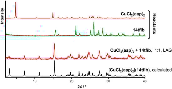 A comparison of the powder X-ray diffraction patterns of the reactants, the LAG product, and the pattern calculated from the [CuCl2(aap)2](14tfib) single crystal X-ray diffraction data.
