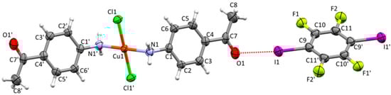 In the crystal structure, each CuCl2(aap)2 unit is associated with two 14tfib molecules via almost linear I···O halogen bonds (d(I1···O1) = 2.988 Å, ∠ (C1–I9···O1) = 173°), forming halogen-bonded chains. (Figure 4a). This halogen bond can be considered relatively strong, as evidenced not only by its linearity, but also by the relatively large value of the donor···acceptor distance shortening, 14.6%, with respect to the sum of the corresponding van der Waals radii of atoms [60]. Each coordinated Cl atom is only involved as an acceptor in N–H···Cl hydrogen bonding (d(N1···Cl1) = 3.466 Å, ∠ (N1–H1A···Cl1) = 165°) with the amino group of an adjacent molecule, similar to the CuCl2(aap)2 parent complex (Figure 4b). We therefore conclude that there appears to be no competition between the chloride ligand and the carbonyl functional group for halogen bonding with 14tfib. The combination of halogen and hydrogen bonding leads to the formation of layers (Figure 4a). The overall structure results from the stacking of such layers along the [3 0 13] crystallographic direction (Figure 4c).