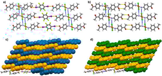 Parts of the crystal structure of (a) [CuCl2(aap)2](14tfib) showcasing the 2D network formed by a combination of halogen (colored orange) and hydrogen bonds (colored blue), (b) CuCl2(aap)2 with the 2D network resulting from a combination of N–H···Cl and C–H···O hydrogen bonds (colored blue and yellow, respectively). Layer stacking in (c) [CuCl2(aap)2](14tfib) and (d) CuCl2(aap)2. For clarity, adjacent layers are color-coded orange and blue/green.