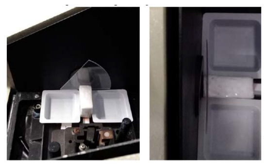 In order to investigate the optical properties of each considered sample, useful to identify the material with the best characteristics in terms of transparency, the absorbance A was measured in the visible light (λ = 300–900 nm) by means of a Lambda 25 Perkin-Elmer ultraviolet/visible spectrophotometer (PerkinElmer, Waltham, MA, USA). The analysis was carried out in transmission, by positioning the disk on the ad hoc polystyrene support perpendicularly to the incident beam. In particular, the presence of the polystyrene support is crucial to collocate the disk in the same position during each analysis, in order to guarantee the transmission by the same area of the disk, so as to control the reproducibility of repeated analyses and to compare data before and after the immersion in the staining aging solutions (Figure 1). This is an important factor to be considered to achieve good and reproducible results, because a very little shift during the measurement corresponds to a great variation of the absorbance value.