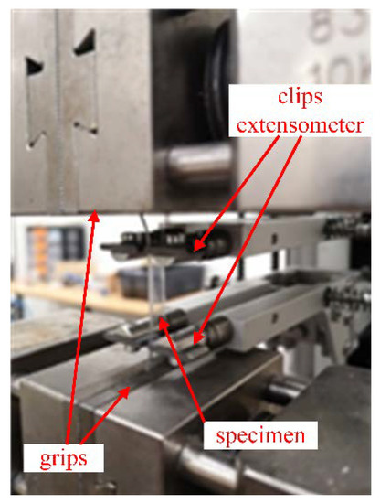 The tensile test and dynamic-mechanical analysis were performed to characterise the main mechanical properties of the as-received disks by following previous results from literature [11,19,21,26,27,28,29,30] and UNI EN ISO 527-2 [31]. The tensile test was completed using the same thickness as the manufacturer, and the specimens were bone-shaped (geometry 1BA from standard UNI EN ISO 527-2 [31]) and their gauge was 6 mm wide and 30 mm long. The quasi-static tensile tests were conducted by a standard electromechanical machine (model Zwick/Roell® Z050, Zwick Roell, Genova, Italy) imposing a crosshead speed of 5 mm/min [32,33]. The force was measured with a load cell of 5 kN and a high-resolution extensometer for precise measurement of the elongation within the gauge length was used (Figure 2). All tests were conducted at room temperature (about 20 °C).
