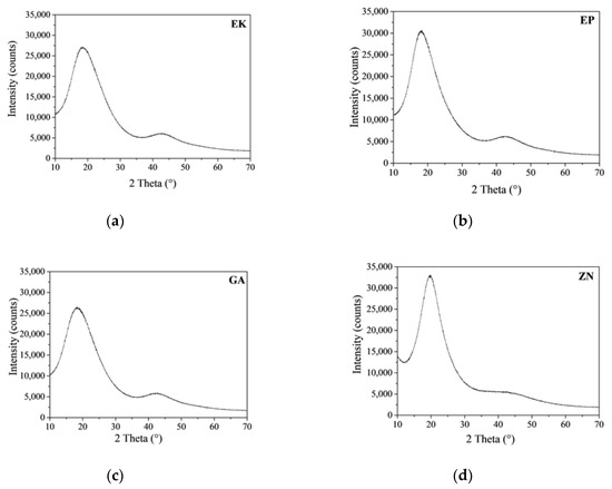 X-ray diffraction (XRD) spectra of the as-received thermoplastic materials: (a) EK; (b) EP; (c) GA; (d) ZN.