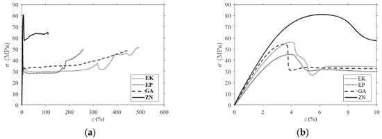 Comparison of the experimental stress–strain curves (a) until break; (b) a magnification in the elastic and post-peak phase.