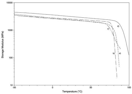 Representative storage modulus (E’) vs. temperature curves are reported in Figure 7. Storage modulus values at room temperature (E’RT) and glass transition temperature values (Tgonset, determined as onset at the of the E’ curve drop) are reported in Table 5.