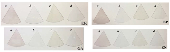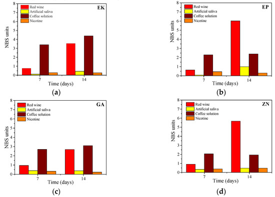 These results are confirmed and quantified by the colorimetric measurements, reported in Figure 9. According to the descriptions of colour changes established by the NBS system (Table 2), all the samples, maintained up to 7 days in immersion, reveal NBS values ranging from an extremely slight colour change (NBS < 0.5) to a slight change (NBS < 1.5), except for the immersion in the coffee solution. In this latter case, EP, GA and ZN samples show a perceivable colour variation (NBS < 3), while the EK sample displays marked change in the colour (NBS > 3).