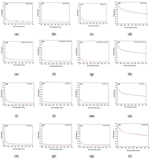 Comparison of absorbance curves of the thermoplastic disks before (black line) and after (red line) 14 days of immersion into staining agents. (a–d) red wine (EK, EP, GA and ZN samples, respectively); (e–h) artificial saliva (EK, EP, GA and ZN samples, respectively); (i–n) coffee (EK, EP, GA and ZN samples, respectively); (o–r) nicotine solution (EK, EP, GA and ZN samples, respectively).